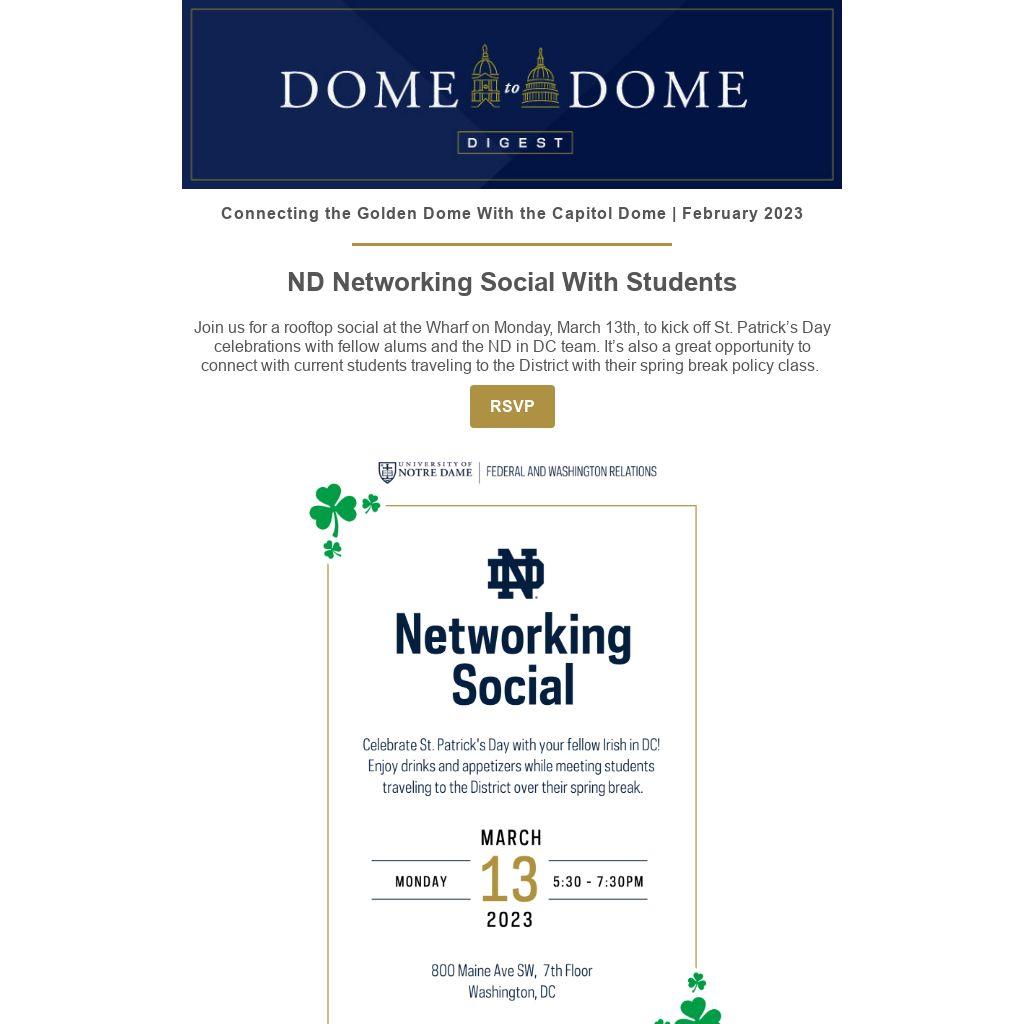 Join us for a rooftop social at the Wharf on Monday, March 13th, to kick off St. Patrick’s Day celebrations with fellow alums and the ND in DC team. It’s also a great opportunity to connect with current students traveling to the District with their spring break policy class.