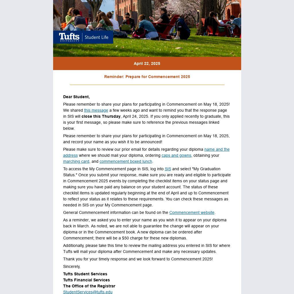 Additionally, please take this time to review the mailing address you entered in SIS for where Tufts will mail your diploma after Commencement and make any necessary updates.