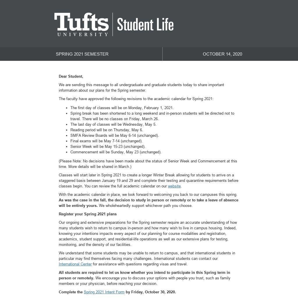 Your health, safety, and well-being, as well as that of others at Tufts and in our larger communities, are paramount. Nothing has been more important in our decision-making about our plans for the Spring.