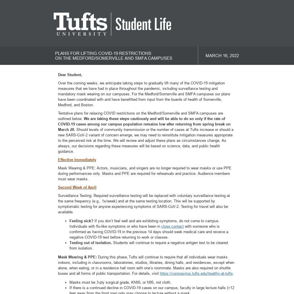 Tentative plans for relaxing COVID restrictions on the Medford/Somerville and SMFA campuses are outlined below. We are taking these steps cautiously and will be able to do so only if the rate of COVID-19 cases among our campus population remains low after returning from spring break on March 28. Should levels of community transmission or the number of cases at Tufts increase or should a new SARS-CoV-2 variant of concern emerge, we may need to reinstitute mitigation measures appropriate to the perceived risk at the time. We will review and adjust these plans as circumstances change. As always, our decisions regarding these measures will be based on science, data, and public health guidance.