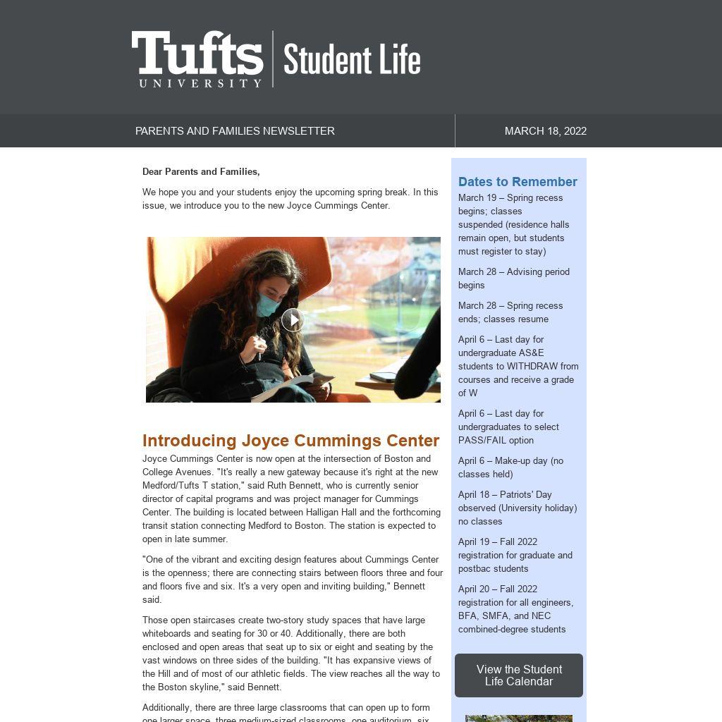 Faculty began moving into Cummings Center in November, and the building opened in January for Spring 2022 classes. The new occupants include the economics, mathematics, and computer science departments; Data Intensive Studies Center (DISC); Center for Applied Brain and Cognitive Sciences (CABCS); Tufts Gordon Institute (including the Derby Entrepreneurship Center); the Tufts Institute for Artificial Intelligence; and The Fletcher School's executive education program and Center for International Environment and Resource Policy.