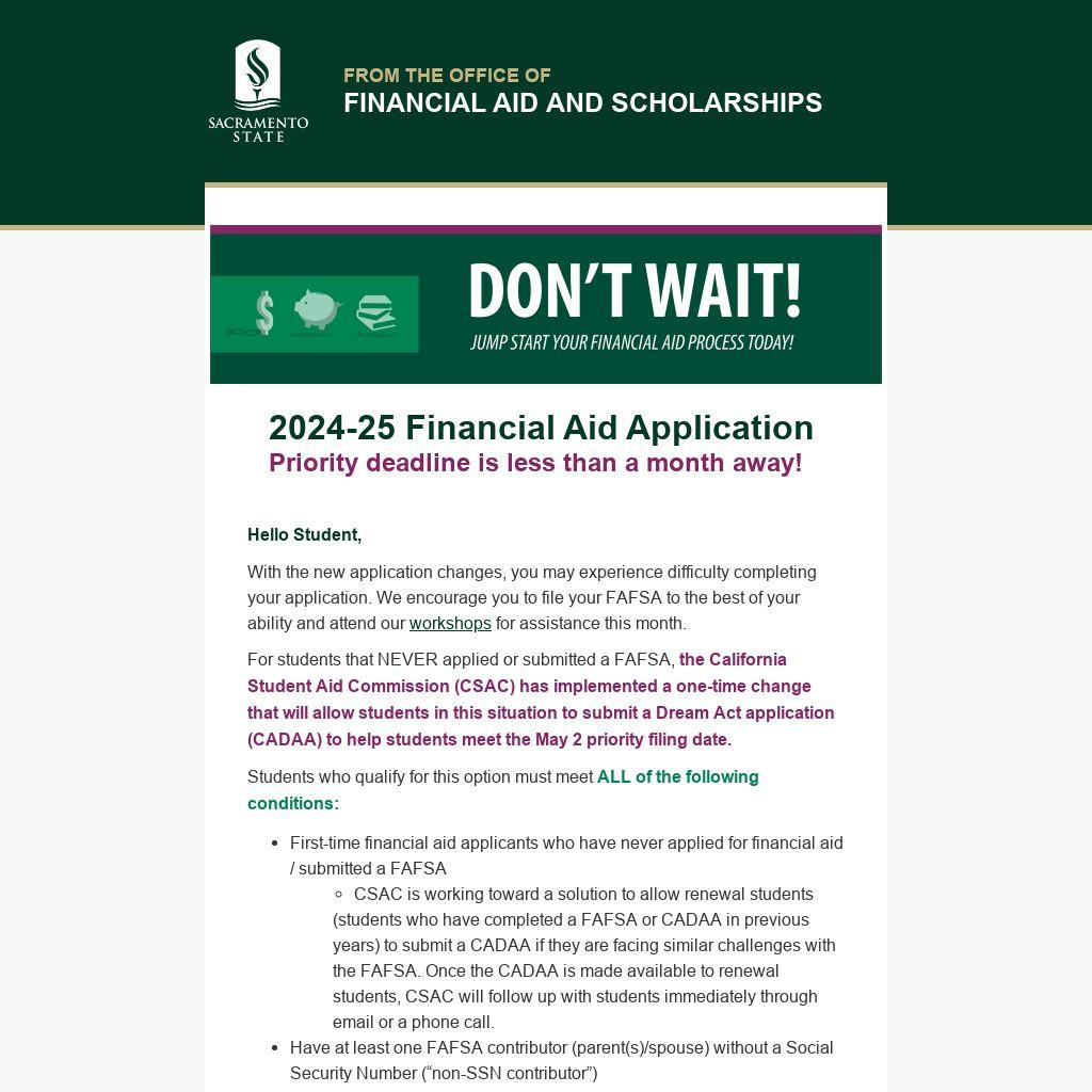 For students that NEVER applied or submitted a FAFSA, the California Student Aid Commission (CSAC) has implemented a one-time change that will allow students in this situation to submit a Dream Act application (CADAA) to help students meet the May 2 priority filing date.