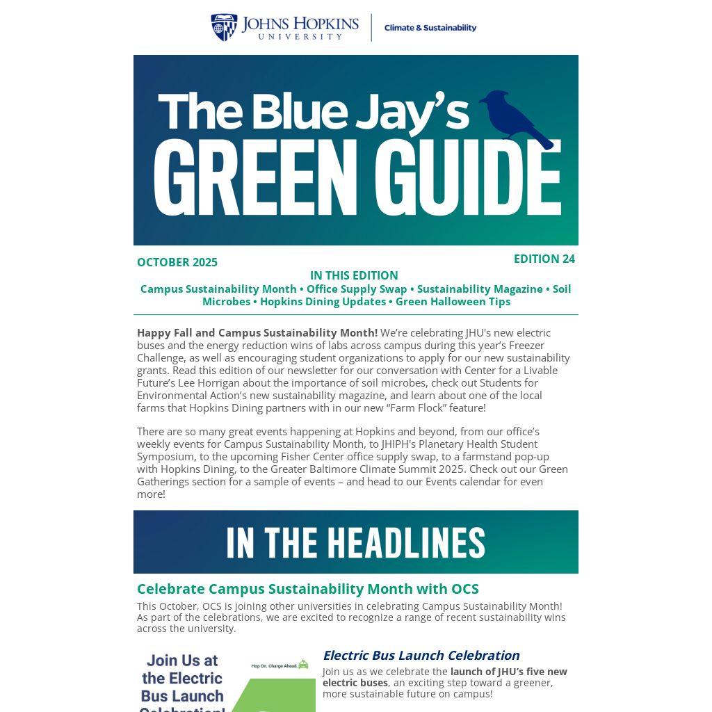 Happy Fall and Campus Sustainability Month! We’re celebrating JHU's new electric buses and the energy reduction wins of labs across campus during this year’s Freezer Challenge, as well as encouraging student organizations to apply for our new sustainability grants. Read this edition of our newsletter for our conversation with Center for a Livable Future’s Lee Horrigan about the importance of soil microbes, check out Students for Environmental Action’s new sustainability magazine, and learn about one of the local farms that Hopkins Dining partners with in our new “Farm Flock” feature!