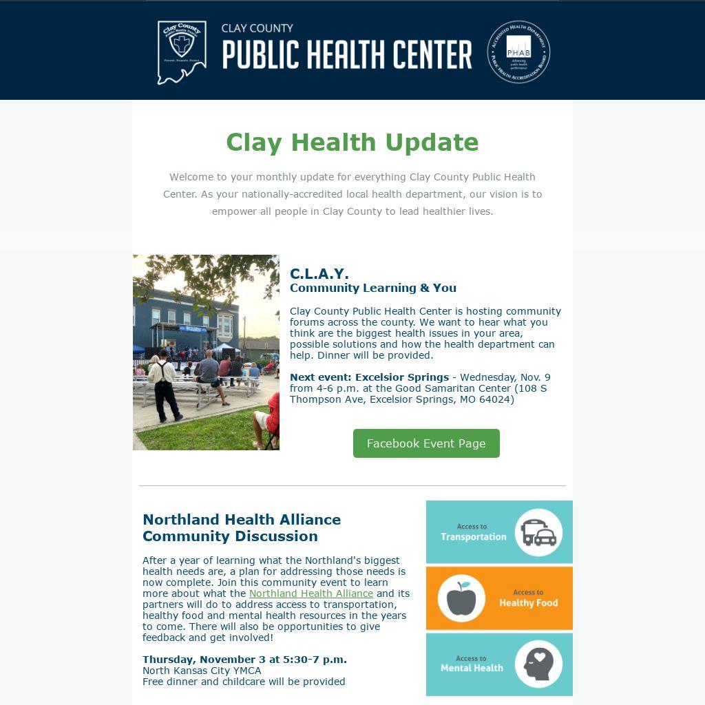 Welcome to your monthly update for everything Clay County Public Health Center. As your nationally-accredited local health department, our vision is to empower all people in Clay County to lead healthier lives.