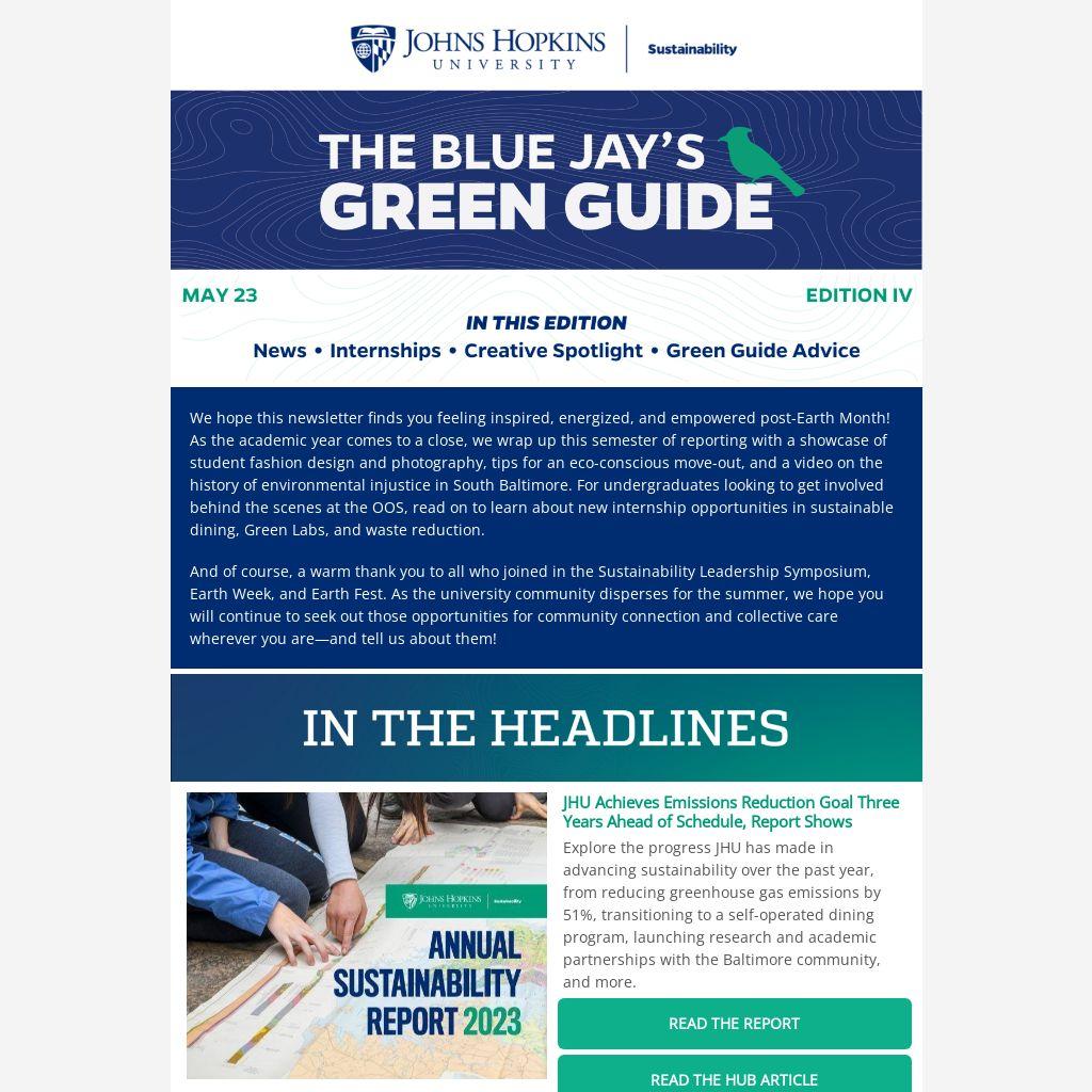 We hope this newsletter finds you feeling inspired, energized, and empowered post-Earth Month! As the academic year comes to a close, we wrap up this semester of reporting with a showcase of student fashion design and photography, tips for an eco-conscious move-out, and a video on the history of environmental injustice in South Baltimore. For undergraduates looking to get involved behind the scenes at the OOS, read on to learn about new internship opportunities in sustainable dining, Green Labs, and waste reduction.