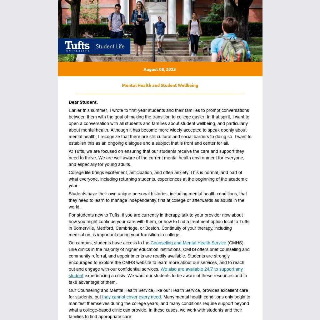 At Tufts, we are focused on ensuring that our students receive the care and support they need to thrive. We are well aware of the current mental health environment for everyone, and especially for young adults.