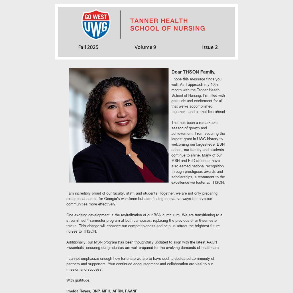 This has been a remarkable season of growth and achievement. From securing the largest grant in UWG history to welcoming our largest-ever BSN cohort, our faculty and students continue to shine. Many of our MSN and EdD students have also earned national recognition through prestigious awards and scholarships, a testament to the excellence we foster at THSON.