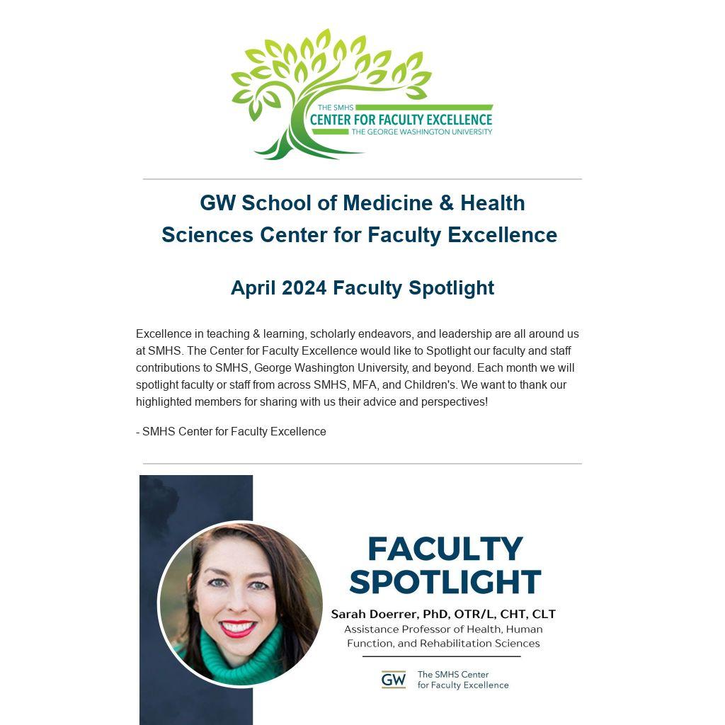 Join the CFE as we highlight Sarah Doerrer, PhD, OTR/L, CHT, CLT. In honor of National Occupational Therapy Month. Sarah will highlight the GW Occupational Therapy program and her journey within the field. Sarah also discusses her research interests, current initiatives to create communities of practice, and her commitment to developing thoughtful and empathetic occupational therapists.