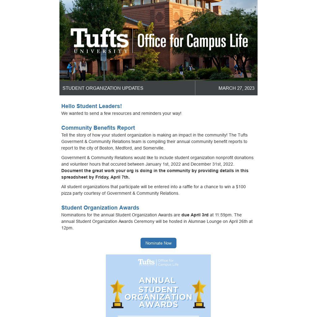 Tell the story of how your student organization is making an impact in the community! The Tufts Goverment & Community Relations team is compiling their annual community benefit reports to report to the city of Boston, Medford, and Somerville.