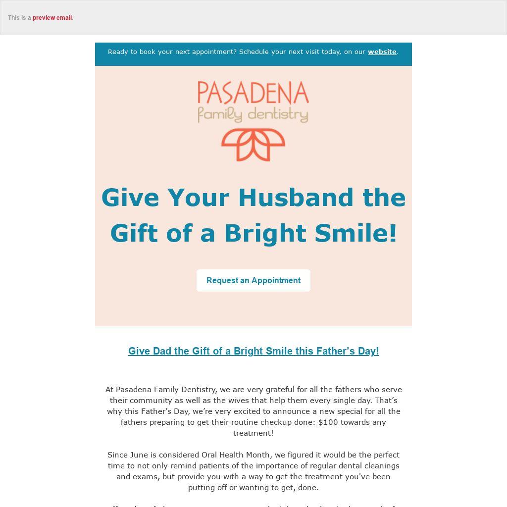 At Pasadena Family Dentistry, we are very grateful for all the fathers who serve their community as well as the wives that help them every single day. That’s why this Father’s Day, we’re very excited to announce a new special for all the fathers preparing to get their routine checkup done: $100 towards any treatment!