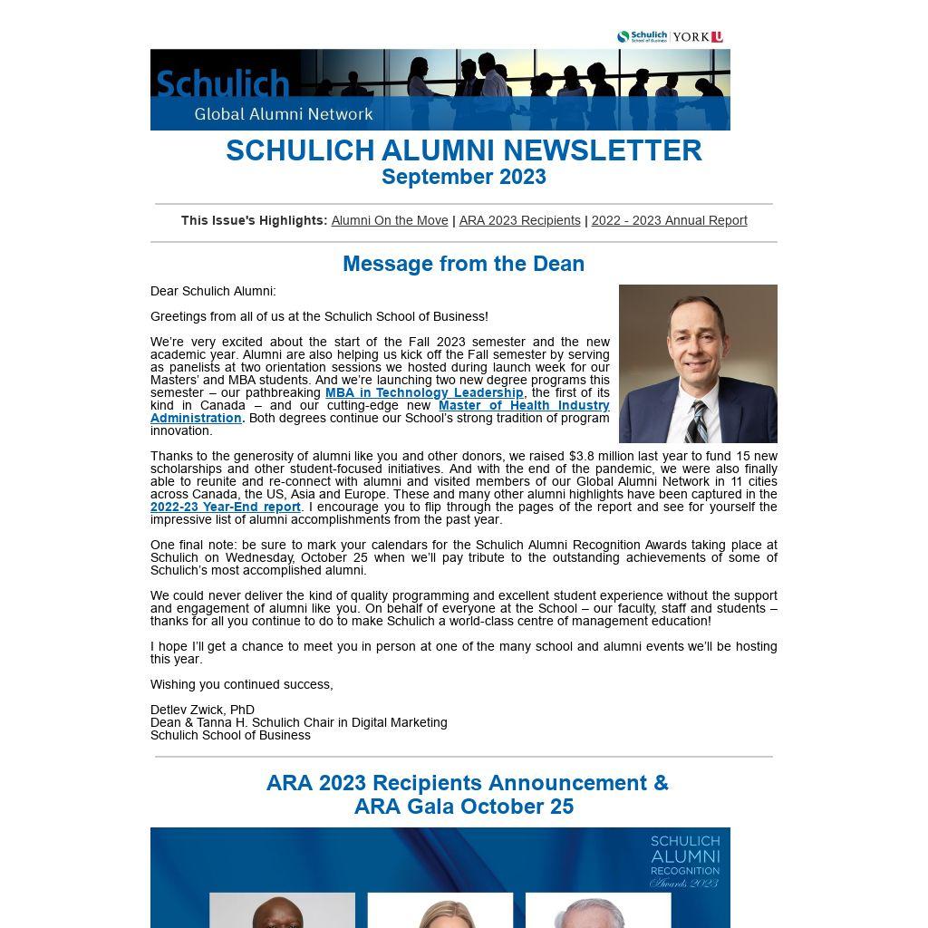 Congratulations to this year’s recipients. We are excited and looking forward to celebrating with you on October 25, 2023. For more information about the awards ceremony and to register for the event, please visit: https://schulich.yorku.ca/alumni/ara/
