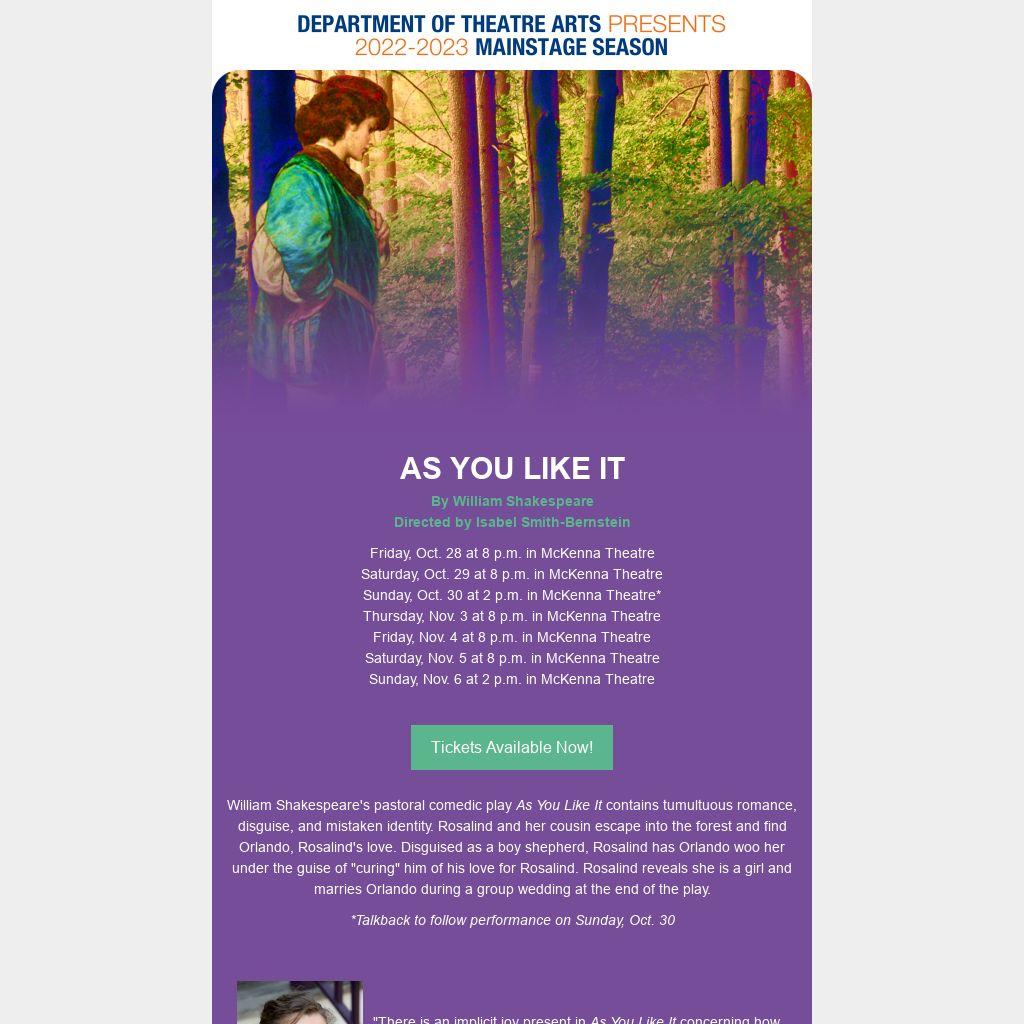 William Shakespeare's pastoral comedic play As You Like It contains tumultuous romance, disguise, and mistaken identity. Rosalind and her cousin escape into the forest and find Orlando, Rosalind's love. Disguised as a boy shepherd, Rosalind has Orlando woo her under the guise of "curing" him of his love for Rosalind. Rosalind reveals she is a girl and marries Orlando during a group wedding at the end of the play.