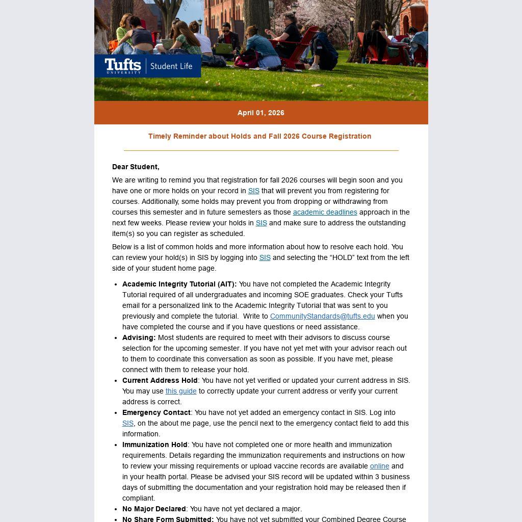We are writing to remind you that registration for fall 2026 courses will begin soon and you have one or more holds on your record in SIS that will prevent you from registering for courses. Additionally, some holds may prevent you from dropping or withdrawing from courses this semester and in future semesters as those academic deadlines approach in the next few weeks. Please review your holds in SIS and make sure to address the outstanding item(s) so you can register as scheduled.