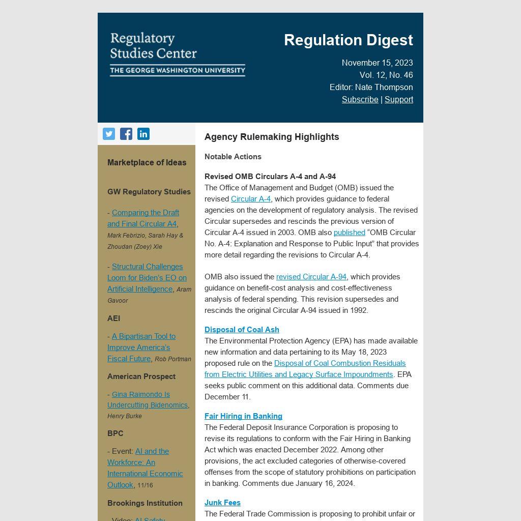 The Office of Management and Budget (OMB) issued the revised Circular A-4, which provides guidance to federal agencies on the development of regulatory analysis. The revised Circular supersedes and rescinds the previous version of Circular A-4 issued in 2003. OMB also published “OMB Circular No. A-4: Explanation and Response to Public Input” that provides more detail regarding the revisions to Circular A-4.