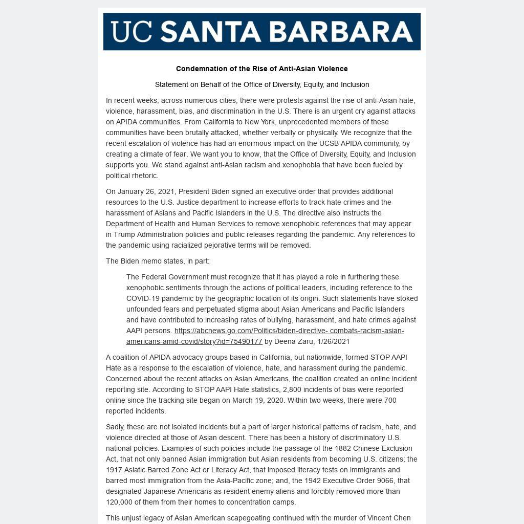 In recent weeks, across numerous cities, there were protests against the rise of anti-Asian hate, violence, harassment, bias, and discrimination in the U.S. There is an urgent cry against attacks on APIDA communities. From California to New York, unprecedented members of these communities have been brutally attacked, whether verbally or physically. We recognize that the recent escalation of violence has had an enormous impact on the UCSB APIDA community, by creating a climate of fear. We want you to know, that the Office of Diversity, Equity, and Inclusion supports you. We stand against anti-Asian racism and xenophobia that have been fueled by political rhetoric.