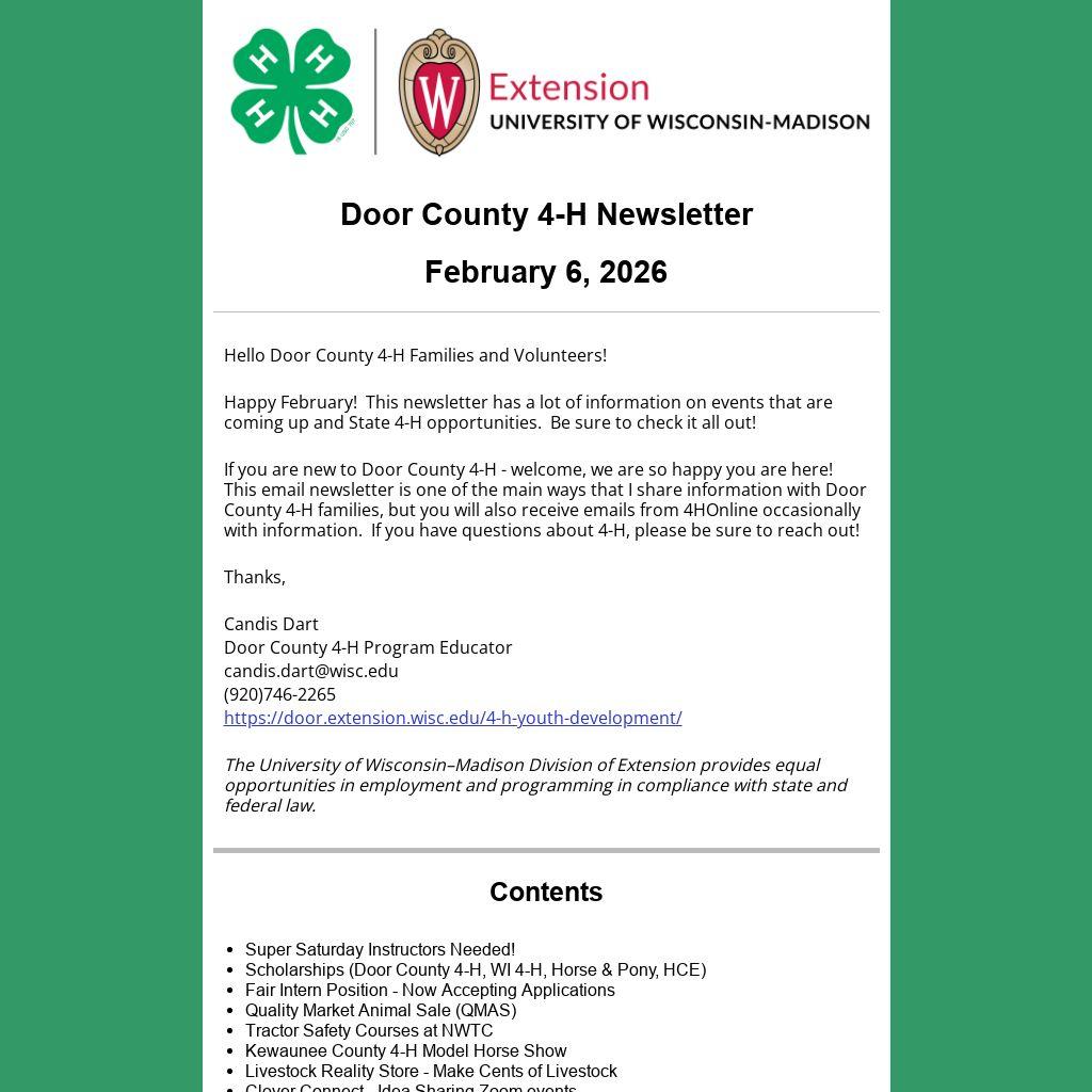 If you are new to Door County 4-H - welcome, we are so happy you are here! This email newsletter is one of the main ways that I share information with Door County 4-H families, but you will also receive emails from 4HOnline occasionally with information. If you have questions about 4-H, please be sure to reach out!