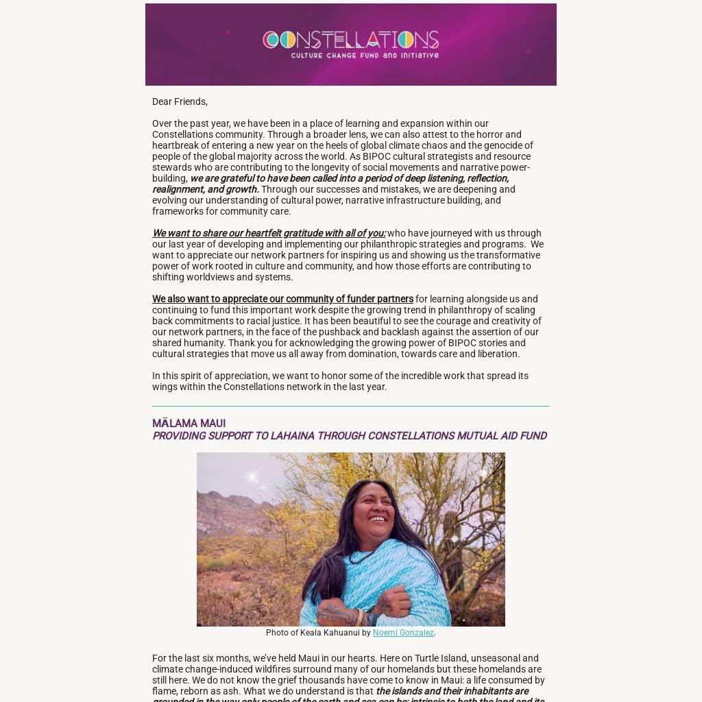 It was our honor to listen to our partners on the ground from Maui and Guam and provide support with their guidance on where to distribute Constellations’ mutual aid funds in the wake of wildfires and a devastating typhoon. The potential in this approach is showing what change is possible, when modest financial resources are directly in the hands of leaders who are most impacted and when those resources flow through the webs of deep relationships within communities.