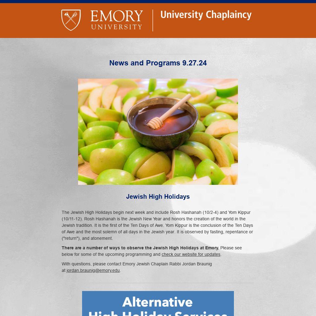 Emory University Chaplaincy ENews is published weekly during term publicizing Atlanta-campus spiritual life programs. It is not a comprehensive listing. For Oxford College spiritual life, please click here. To submit information or to update your preferences, please contact religiouslife@emory.edu.