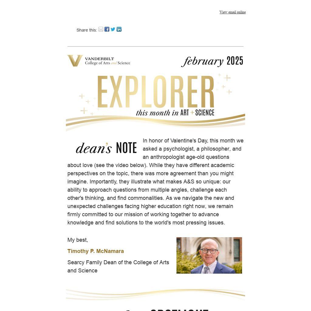 In honor of Valentine's Day, this month we asked a psychologist, a philosopher, and an anthropologist age-old questions about love (see the video below). While they have different academic perspectives on the topic, there was more agreement than you might imagine. Importantly, they illustrate what makes A&S so unique: our ability to approach questions from multiple angles, challenge each other's thinking, and find commonalities. As we navigate the new and unexpected challenges facing higher education right now, we remain firmly committed to our mission of working together to advance knowledge and find solutions to the world's most pressing issues.