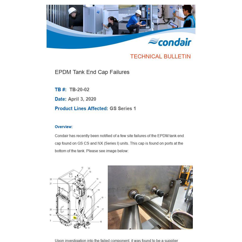 If the EPDM Tank cap fails on a unit in the field, a leak will develop from the bottom of the humidifier tank. Units properly installed with a floor drain or drain pan should see none, or minimal damage to property and low hazard to health and safety. The unit will be inoperable until the failed cap is replaced.