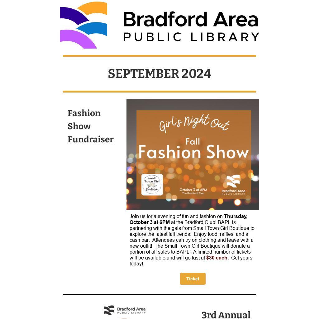Join us for a evening of fun and fashion on Thursday, October 3 at 6PM at the Bradford Club! BAPL is partnering with the gals from Small Town Girl Boutique to explore the latest fall trends. Enjoy food, raffles, and a cash bar. Attendees can try on clothing and leave with a new outfit! The Small Town Girl Boutique will donate a portion of all sales to BAPL! A limited number of tickets will be available and will go fast at $30 each. Get yours today!