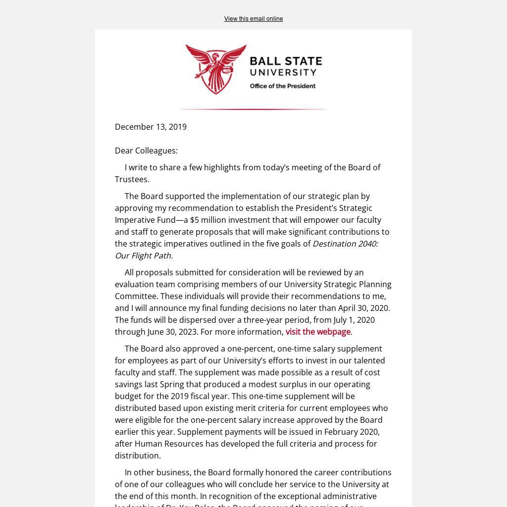The Board also approved a one-percent, one-time salary supplement for employees as part of our University’s efforts to invest in our talented faculty and staff. The supplement was made possible as a result of cost savings last Spring that produced a modest surplus in our operating budget for the 2019 fiscal year. This one-time supplement will be distributed based upon existing merit criteria for current employees who were eligible for the one-percent salary increase approved by the Board earlier this year. Supplement payments will be issued in February 2020, after Human Resources has developed the full criteria and process for distribution.