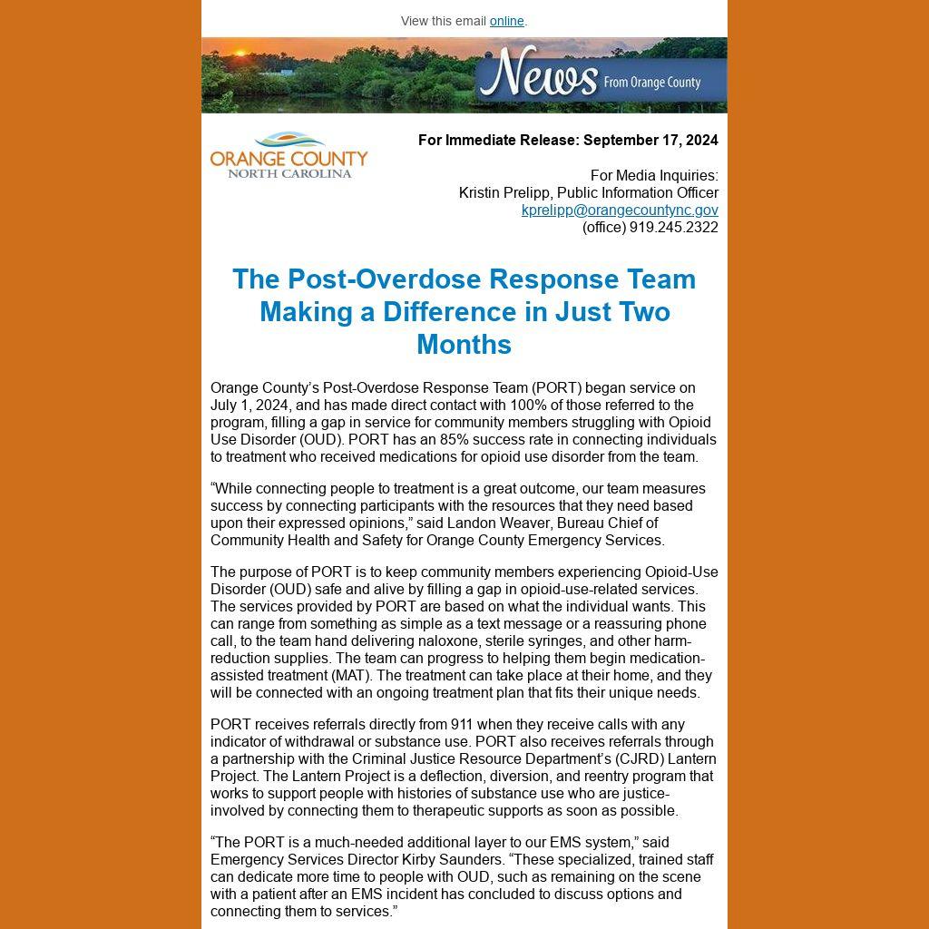 Orange County’s Post-Overdose Response Team (PORT) began service on July 1, 2024, and has made direct contact with 100% of those referred to the program, filling a gap in service for community members struggling with Opioid Use Disorder (OUD). PORT has an 85% success rate in connecting individuals to treatment who received medications for opioid use disorder from the team.