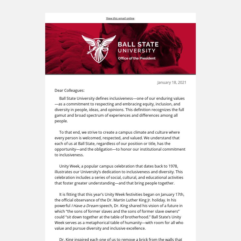 It is fitting that this year’s Unity Week festivities began on January 17th, the official observance of the Dr. Martin Luther King Jr. holiday. In his powerful I Have a Dream speech, Dr. King shared his vision of a future in which “the sons of former slaves and the sons of former slave owners” could “sit down together at the table of brotherhood.” Ball State’s Unity Week serves as a metaphorical table of humanity—with room for all who value and pursue diversity and inclusive excellence.