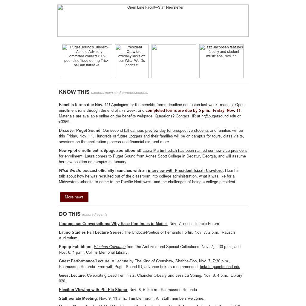 | Benefits forms due Nov. 11! Apologies for the benefits forms deadline confusion last week, readers. Open enrollment runs through the end of this week, and completed forms are due by 5 p.m., Friday, Nov. 11. Materials are available online on the benefits webpage. Questions? Contact HR at hr@pugetsound.edu or x3369.