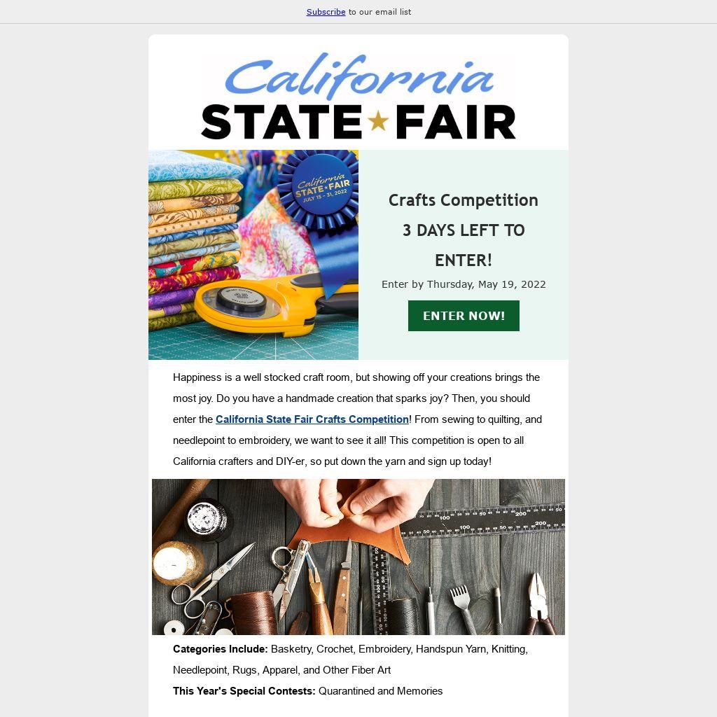 Happiness is a well stocked craft room, but showing off your creations brings the most joy. Do you have a handmade creation that sparks joy? Then, you should enter the California State Fair Crafts Competition! From sewing to quilting, and needlepoint to embroidery, we want to see it all! This competition is open to all California crafters and DIY-er, so put down the yarn and sign up today!