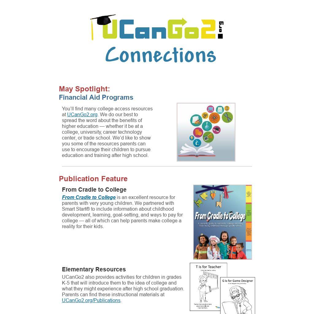UCanGo2 also provides activities for children in grades K-5 that will introduce them to the idea of college and what they might experience after high school graduation. Parents can find these instructional materials at UCanGo2.org/Publications.