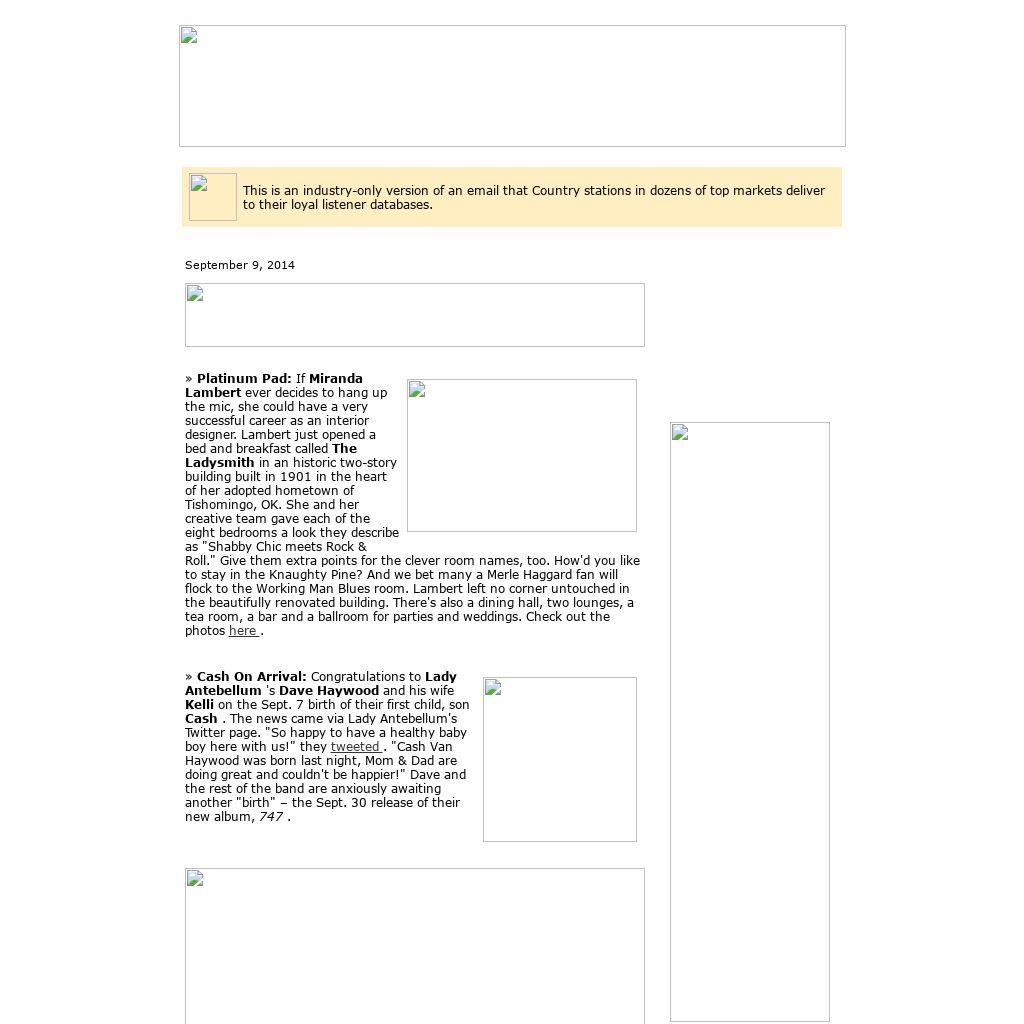 Lady Antebellum has teamed with textile company Divatex to launch a line of linens. The Heartland Home Collection takes cues from the trio's lifestyle and songs to create Americana-inspired bed and bath lines, using plaids, florals and solids. It debuts during New York's Fall Home Fashion Week later this month. Birthdays Tuesday (9/9): Hunter Hayes, Charles Esten, Joey Martin Feek (Joey + Rory), Joe Smyth (Sawyer Brown), John McFee, Tom Wopat. Wednesday (9/10): Ashley Monroe, Tommy Overstreet, Kerry Harvick. Thursday (9/11): Charles Kelley (Lady Antebellum), Richard Bailey (The SteelDrivers), the late Jimmie Davis.