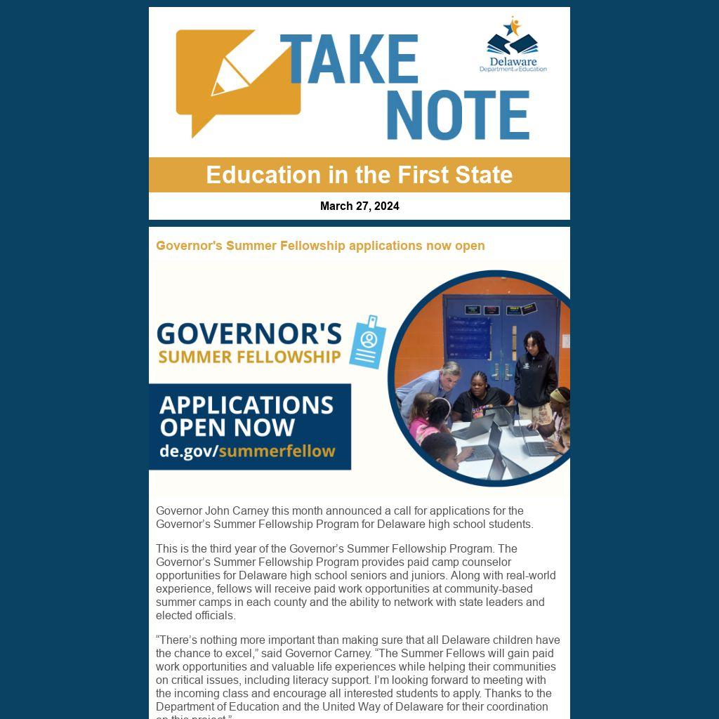 Governor John Carney this month announced a call for applications for the Governor’s Summer Fellowship Program for Delaware high school students.