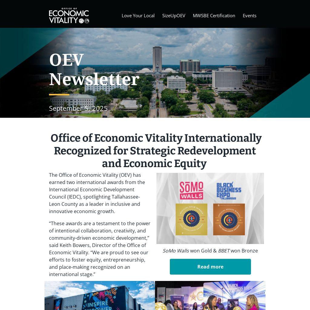 Delve into past issues of the OEV Newsletter to catch up on updates, insights, economic development initiatives, programs, and opportunities in Tallahassee-Leon County!