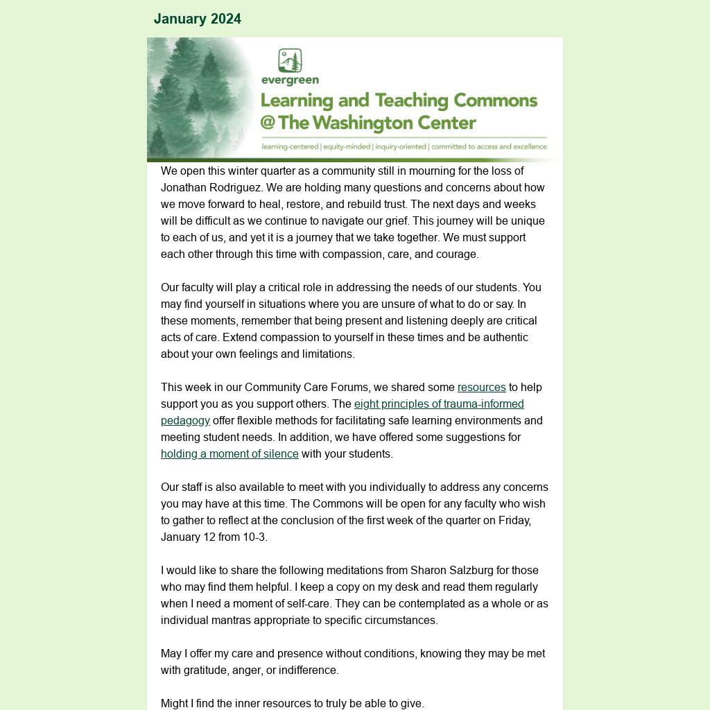 Our staff is also available to meet with you individually to address any concerns you may have at this time. The Commons will be open for any faculty who wish to gather to reflect at the conclusion of the first week of the quarter on Friday, January 12 from 10-3.