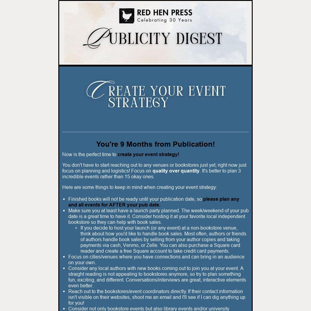 Create a list of bookstores/venues and their contact information. Put together your event pitch (be sure to mention that your book will be published by Red Hen Press, distributed by Publishers Group West so bookstores will know how and where to order your book for the event). Reach out to authors you want to do events with to figure out their availability. You can continue this outreach over the next few months; next month's digest will be all about actually reaching out to bookstores and venues to set these events up!