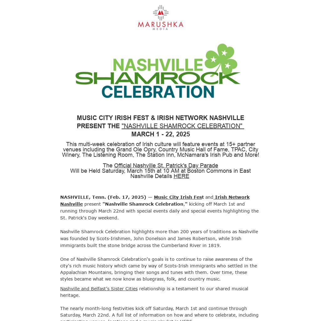 NASHVILLE, Tenn. (Feb. 17, 2025) — Music City Irish Fest and Irish Network Nashville present "Nashville Shamrock Celebration," kicking off March 1st and running through March 22nd with special events daily and special events highlighting the St. Patrick's Day weekend.
