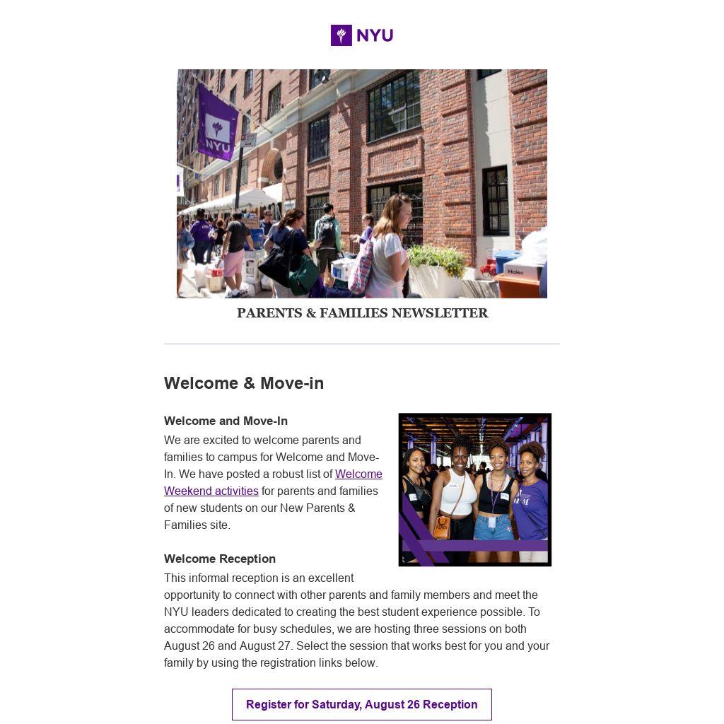 This informal reception is an excellent opportunity to connect with other parents and family members and meet the NYU leaders dedicated to creating the best student experience possible. To accommodate for busy schedules, we are hosting three sessions on both August 26 and August 27. Select the session that works best for you and your family by using the registration links below.