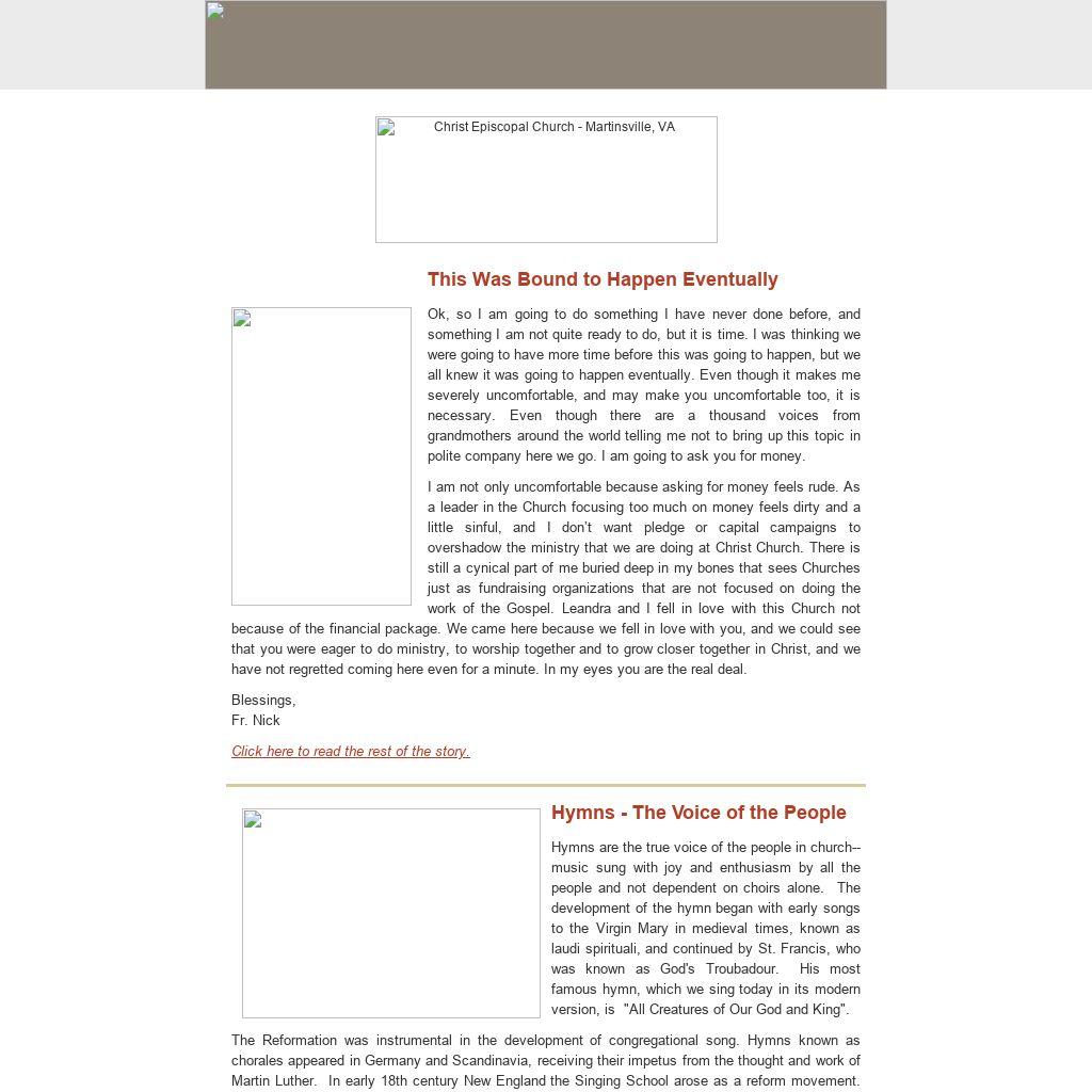 St. Christopher's Choir rehearses at 7 on Thursday evenings. No experience is necessary, please join us as we make a joyful noise unto the Lord!