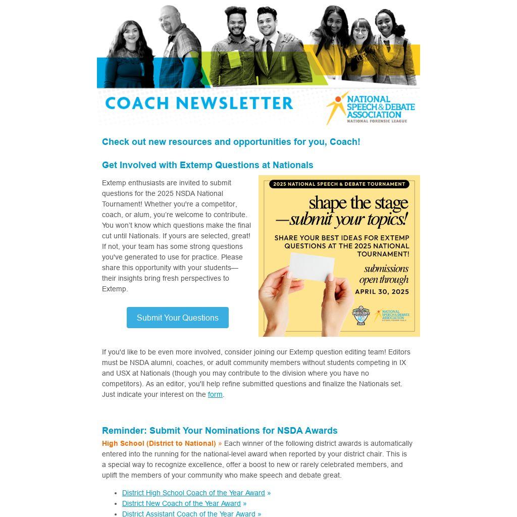 Extemp enthusiasts are invited to submit questions for the 2025 NSDA National Tournament! Whether you're a competitor, coach, or alum, you’re welcome to contribute. You won’t know which questions make the final cut until Nationals. If yours are selected, great! If not, your team has some strong questions you've generated to use for practice. Please share this opportunity with your students—their insights bring fresh perspectives to Extemp.