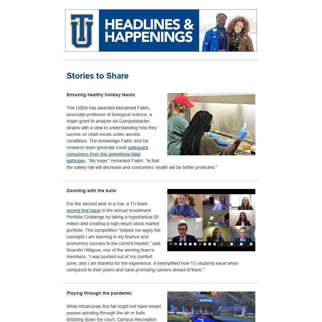 For the second year in a row, a TU team scored first place in the annual Investment Portfolio Challenge by taking a hypothetical $5 million and creating a high-return stock market portfolio. The competition “helped me apply the concepts I am learning in my finance and economics courses to the current market,” said Kearstin Hilligoss, one of the winning team’s members. “I was pushed out of my comfort zone, and I am thankful for the experience. It exemplified how TU students excel when compared to their peers and have promising careers ahead of them.”