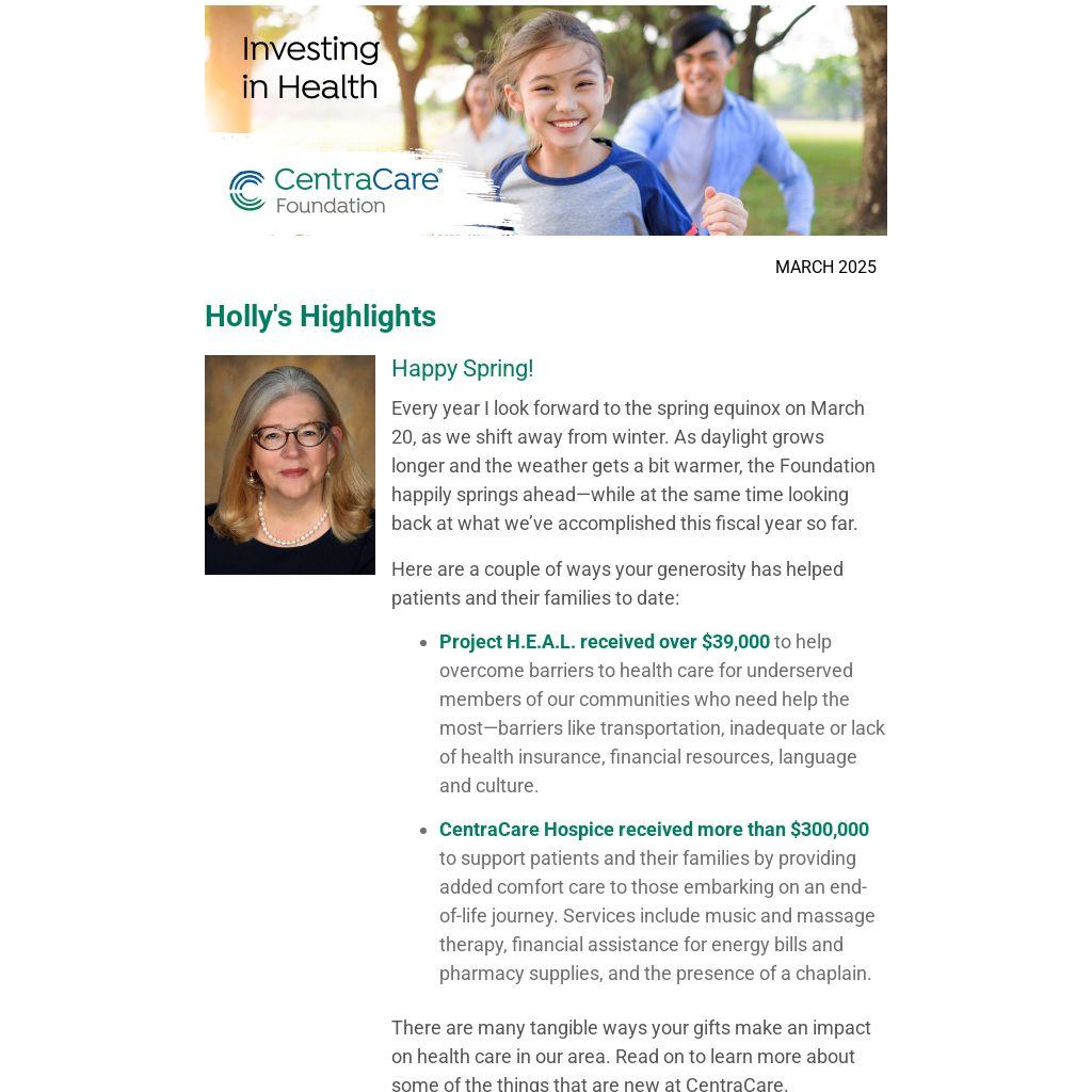 CentraCare Hospice received more than $300,000 to support patients and their families by providing added comfort care to those embarking on an end-of-life journey. Services include music and massage therapy, financial assistance for energy bills and pharmacy supplies, and the presence of a chaplain.