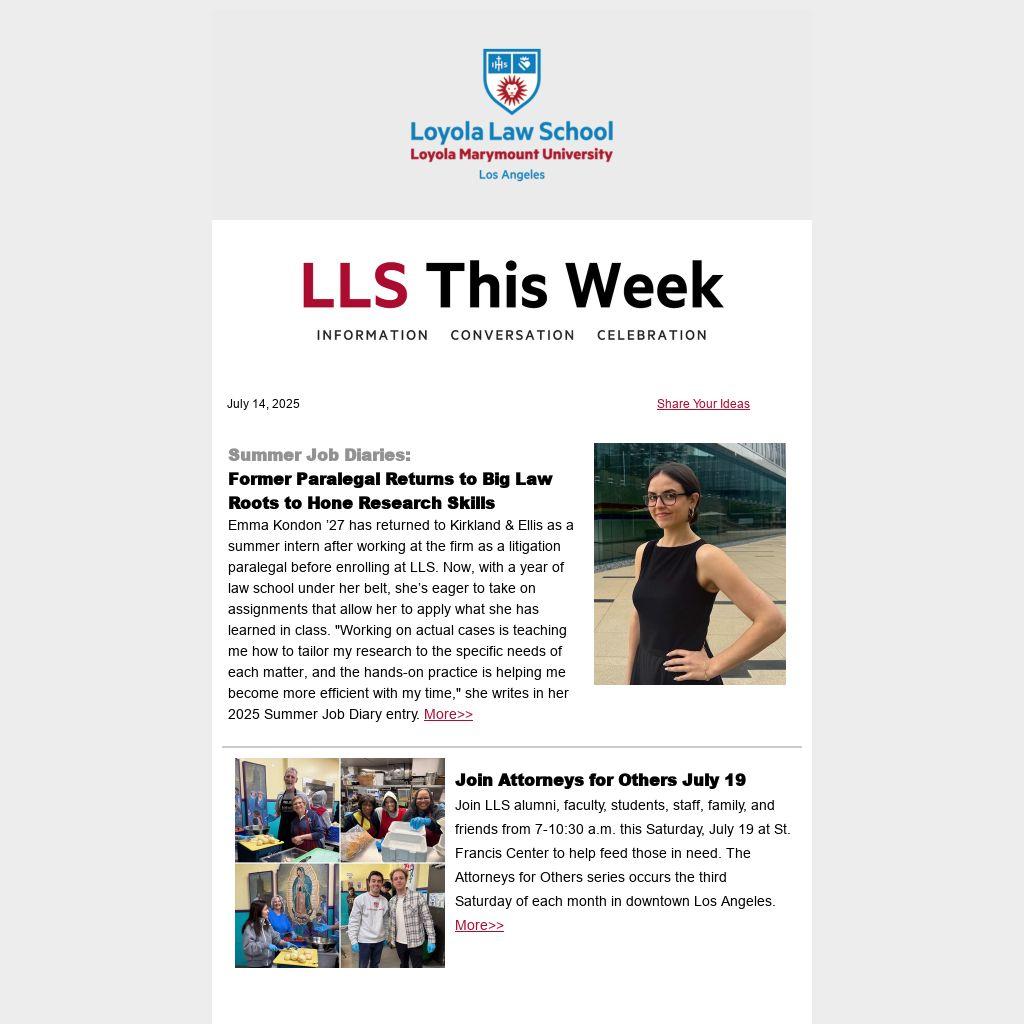 Join Attorneys for Others July 19 Join LLS alumni, faculty, students, staff, family, and friends from 7-10:30 a.m. this Saturday, July 19 at St. Francis Center to help feed those in need. The Attorneys for Others series occurs the third Saturday of each month in downtown Los Angeles. More>>