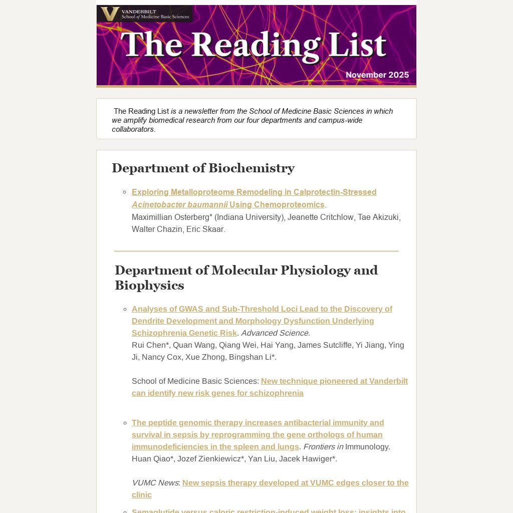 The Reading List is a newsletter from the School of Medicine Basic Sciences in which we amplify biomedical research from our four departments and campus-wide collaborators.