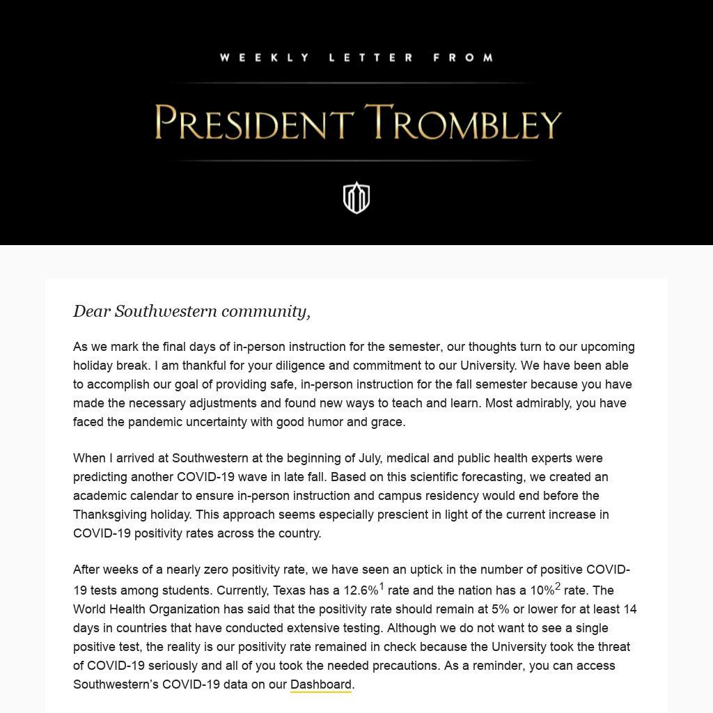 2 rate. The World Health Organization has said that the positivity rate should remain at 5% or lower for at least 14 days in countries that have conducted extensive testing. Although we do not want to see a single positive test, the reality is our positivity rate remained in check because the University took the threat of COVID-19 seriously and all of you took the needed precautions. As a reminder, you can access Southwestern’s COVID-19 data on our