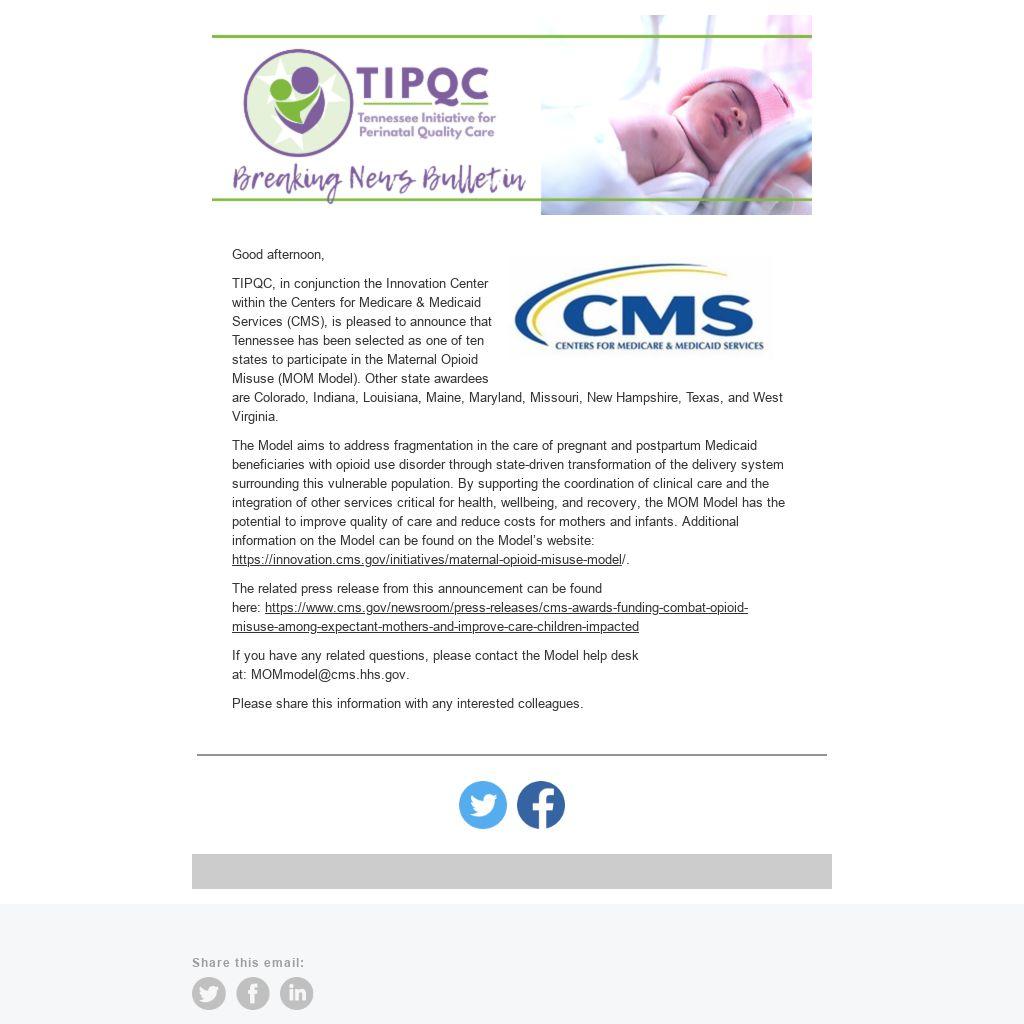 TIPQC, in conjunction the Innovation Center within the Centers for Medicare & Medicaid Services (CMS), is pleased to announce that Tennessee has been selected as one of ten states to participate in the Maternal Opioid Misuse (MOM Model). Other state awardees are Colorado, Indiana, Louisiana, Maine, Maryland, Missouri, New Hampshire, Texas, and West Virginia.