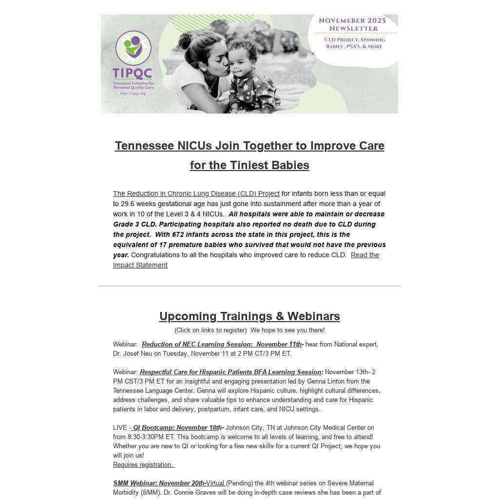 TIPQC along with TDH MHI hosted three Spinning Babies Classes to 94 individuals from 28 hospitals and 12 doula organizations in September 2025. During these 8-hour, in person workshops, attendees learned the different balancing techniques, labor positioning techniques, and physiology to address stalls in labor to further support TN moms and babies in labor & delivery.