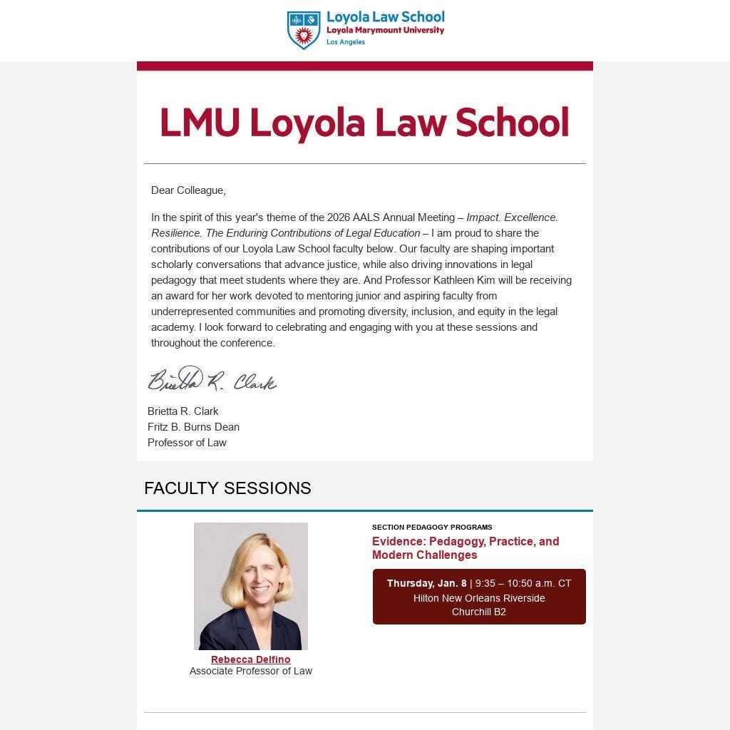 In the spirit of this year's theme of the 2026 AALS Annual Meeting – Impact. Excellence. Resilience. The Enduring Contributions of Legal Education – I am proud to share the contributions of our Loyola Law School faculty below. Our faculty are shaping important scholarly conversations that advance justice, while also driving innovations in legal pedagogy that meet students where they are. And Professor Kathleen Kim will be receiving an award for her work devoted to mentoring junior and aspiring faculty from underrepresented communities and promoting diversity, inclusion, and equity in the legal academy. I look forward to celebrating and engaging with you at these sessions and throughout the conference.