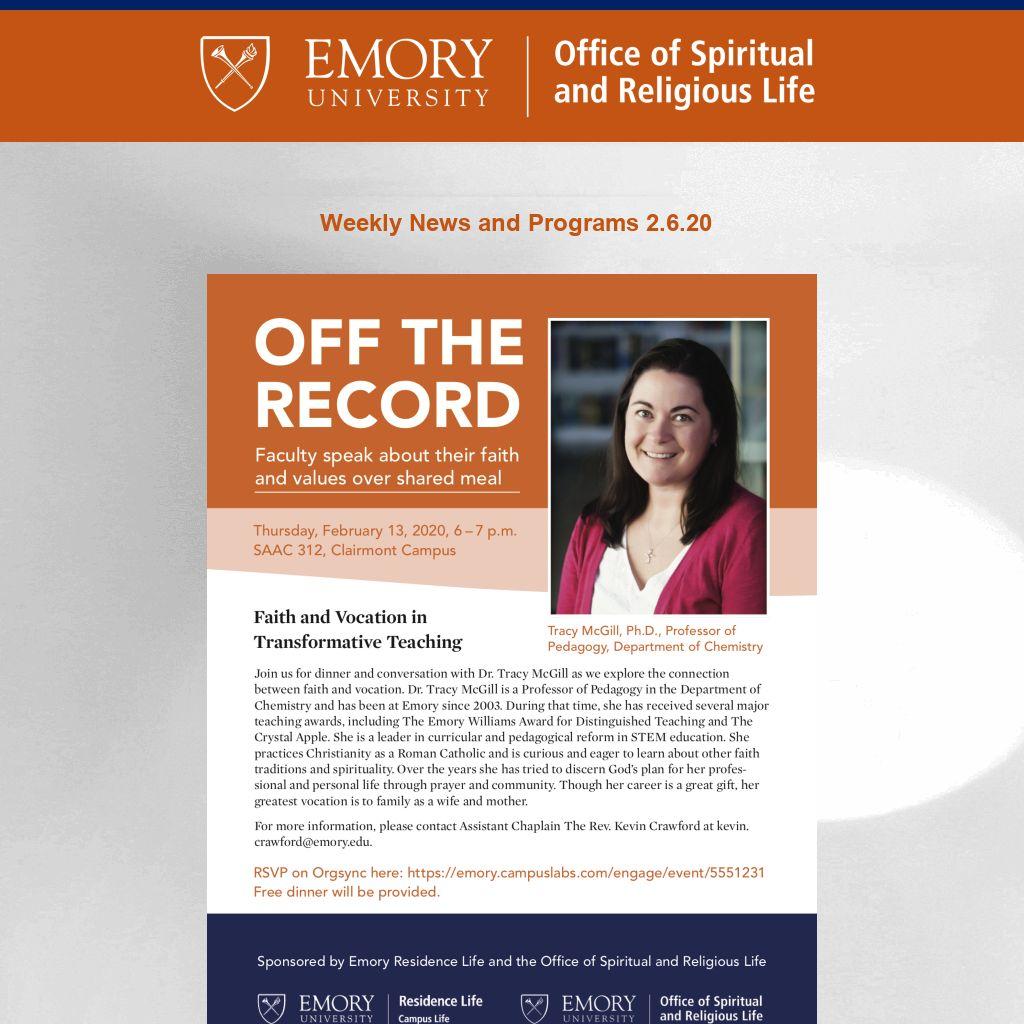 Emory OSRL Enews is published weekly during term by the Emory University Office of Spiritual and Religious Life covering Atlanta-campus programs. For Oxford College spiritual life, please click here. To submit information or to update your preferences, please contact religiouslife@emory.edu.