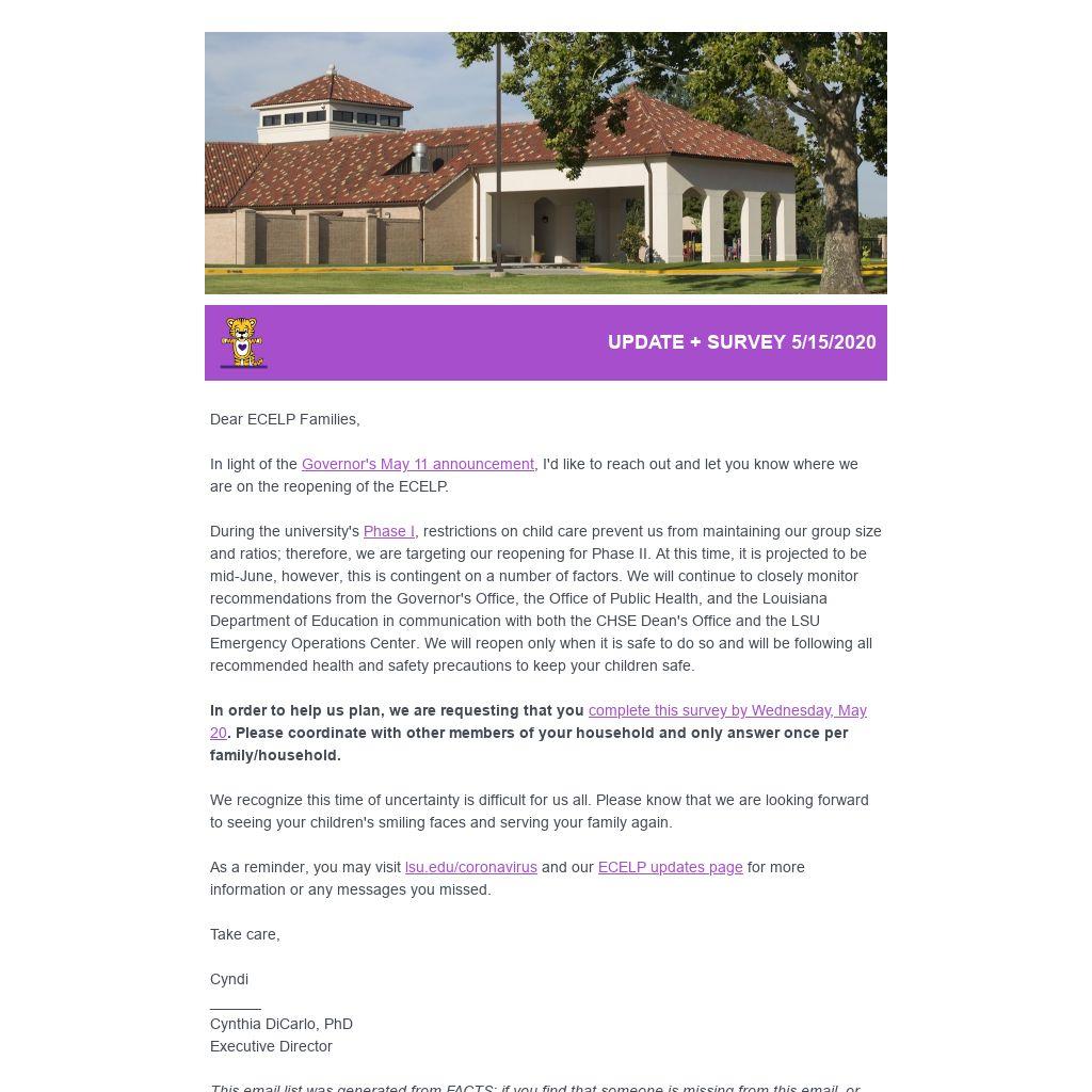 In order to help us plan, we are requesting that you complete this survey by Wednesday, May 20. Please coordinate with other members of your household and only answer once per family/household. We recognize this time of uncertainty is difficult for us all. Please know that we are looking forward to seeing your children's smiling faces and serving your family again. As a reminder, you may visit lsu.edu/coronavirus and our ECELP updates page for more information or any messages you missed. Take care,